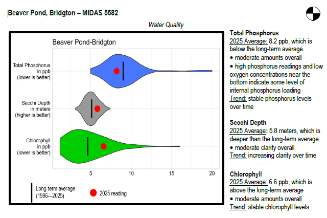 Beaver Pond surface water chlorophyll (ppb), phosphorus (ppb), and Secchi depth (meters) data comparison. Colored areas represent the long-term range of values, from minimum to maximum. Area thickness indicates frequency of measurements at that value. Area thickness increases as more measurements are reported at that value. The vertical black line represents the long-term average value. The large red dot represents 2025’s average value. The small red dots represent individual readings taken in 2025.