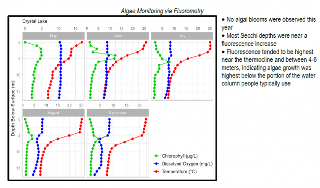 Algae Monitoring SummaryGraphs have been included for each test site to visually compare fluorometer, temperature, and oxygen profiles from May through September. The vertical axis (y-axis) indicates depth below the surface, while the horizontal axis (x-axis) represents reported values. Three different parameters are being reported on the same graph, which results in the value units for the horizontal axis varying, based on parameter. Units are noted in parentheses in the legend.