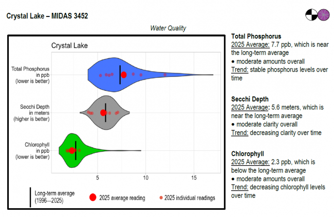 Crystal Lake surface water chlorophyll (ppb), phosphorus (ppb), and Secchi depth (meters) data comparison. Colored areas represent the long-term range of values, from minimum to maximum. Area thickness indicates frequency of measurements at that value. Area thickness increases as more measurements are reported at that value. The vertical black line represents the long-term average value. The large red dot represents 2025’s average value. The small red dots represent individual readings taken in 2025.