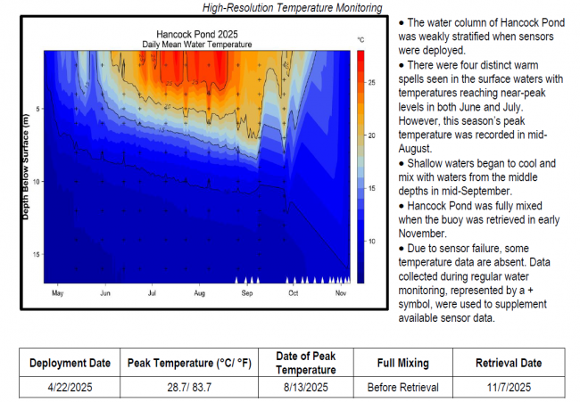 Careful monitoring and continued boat inspections are needed to ensure that Hancock Pond remains free of invasive aquatic plants such as milfoil. LEA First monitored Hancock Pond in 1975 and continues to monitor water quality biweekly in the open water season and in the winter when the ice is safe.