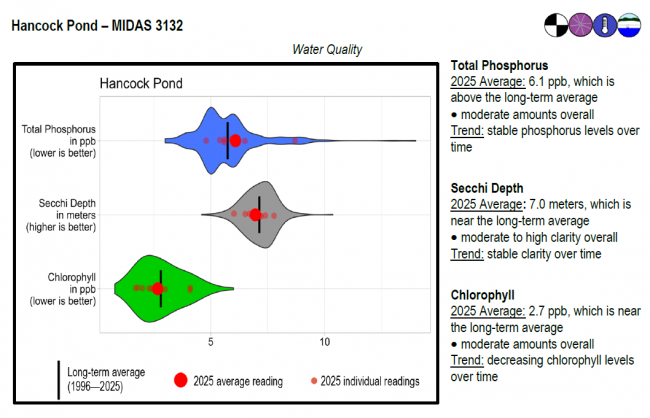 Hancock Pond surface water chlorophyll (ppb), phosphorus (ppb), and Secchi depth (meters) data comparison. Colored areas represent the long-term range of values, from minimum to maximum. Area thickness indicates frequency of measurements at that value. Area thickness increases as more measurements are reported at that value. The vertical black line represents the long-term average value. The large red dot represents 2025’s average value. The small red dots represent individual readings taken in 2025.