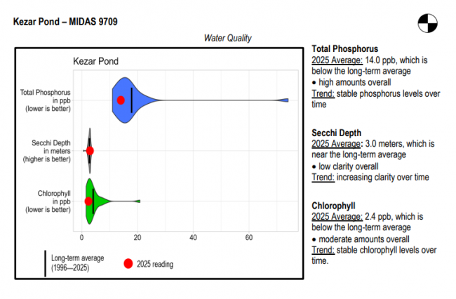 Kezar Pond surface water chlorophyll (ppb), phosphorus (ppb), and Secchi depth (meters) data comparison. Colored areas represent the long-term range of values, from minimum to maximum. Area thickness indicates frequency of measurements at that value. Area thickness increases as more measurements are reported at that value. The vertical black line represents the long-term average value. The large red dot represents 2025’s average value. The small red dots represent individual readings taken in 2025.