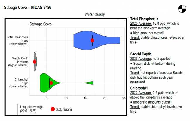 Sebago Cove surface water chlorophyll (ppb), phosphorus (ppb), and Secchi depth (meters) data comparison. Colored areas represent the long-term range of values, from minimum to maximum. Area thickness indicates frequency of measurements at that value. Area thickness increases as more measurements are reported at that value. The vertical black line represents the long-term average value. The large red dot represents 2025’s average value. The small red dots represent individual readings taken in 2025.