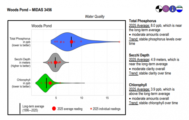 Woods Pond surface water chlorophyll (ppb), phosphorus (ppb), and Secchi depth (meters) data comparison. Colored areas represent the long-term range of values, from minimum to maximum. Area thickness indicates frequency of measurements at that value. Area thickness increases as more measurements are reported at that value. The vertical black line represents the long-term average value. The large red dot represents 2025’s average value. The small red dots represent individual readings taken in 2025.