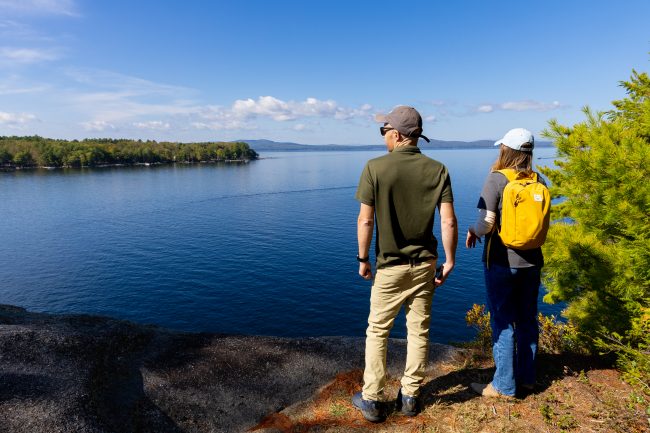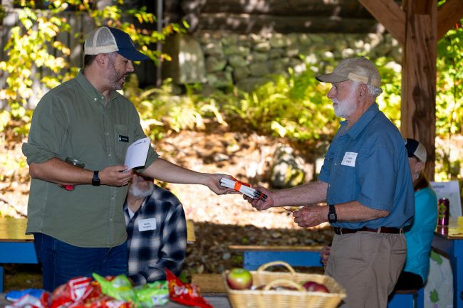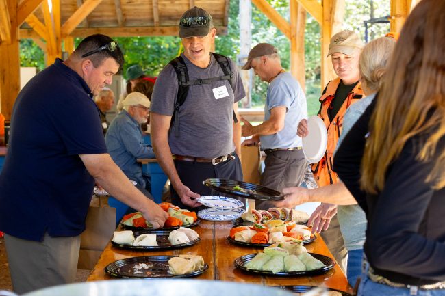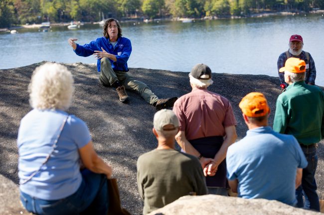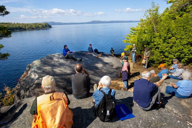 After a morning of networking with foresters and resource professionals, participants joined forestry walks for a hands-on opportunity to learn about forest management. Foresters Jesse Duplin, Shane Duigan, and Paul Larrivee led walks covering basic forest management principles as well as emerging concerns such as beech leaf disease and hemlock woolly adelgid. Meanwhile, on the shores of Sebago Lake, Maine Audubon’s Sally Stockwell and Maine IF&W biologist Joe Roy talked to a group about enhancing forests for fish, birds, and other wildlife. Back at camp, another group gathered to learn about Tree Farming with Kayci Willis of Maine Tree Farm. A highlight this year was the opportunity to visit the famous Frye’s Leap, a beautiful rocky ledge overlooking Sebago Lake, located on the camp property. Woodland owners gathered on the smooth granite to enjoy the view and learn about water quality and the work of Sebago Clean Waters from Paul Hunt of Portland Water District.