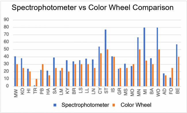 Elly found that the two methods produce data that follow similar patterns, but spectrophotometer-based results provide a more precise, less objective measurement.