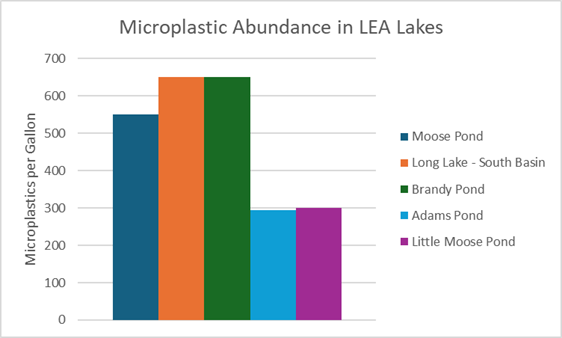 Catherine and Billy quantified microplastic densities from water samples collected near the middle of the lake on Moose Pond, Long Lake’s south basin, Brandy Pond, Adams Pond, and Little Moose Pond. In all water samples analyzed, they found microplastics. Brandy Pond and Long Lake had the highest densities, followed by Moose Pond, and Little Moose Pond and Adams Pond contained the least microplastics. In general, the level of microplastics in the water increased as the amount of development on the lake increased.