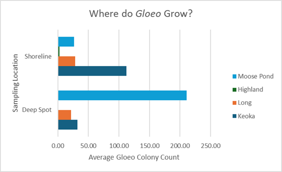 Henry found that Highland Lake had the least amount of Gloeotrichia in both locations sampled. Moose Pond had more Gloeotrichia in the middle of the lake near the deepest location than at the shore. Keoka Lake had more Gloeotrichia near the shore than it did at the deep spot, and Long Lake had similar amounts of Gloeotrichia at both sampling sites. While more data would be needed to have conclusive results, his sampling did not indicate that Gloeotrichia is more prevalent near the shore, which is often presumed.
